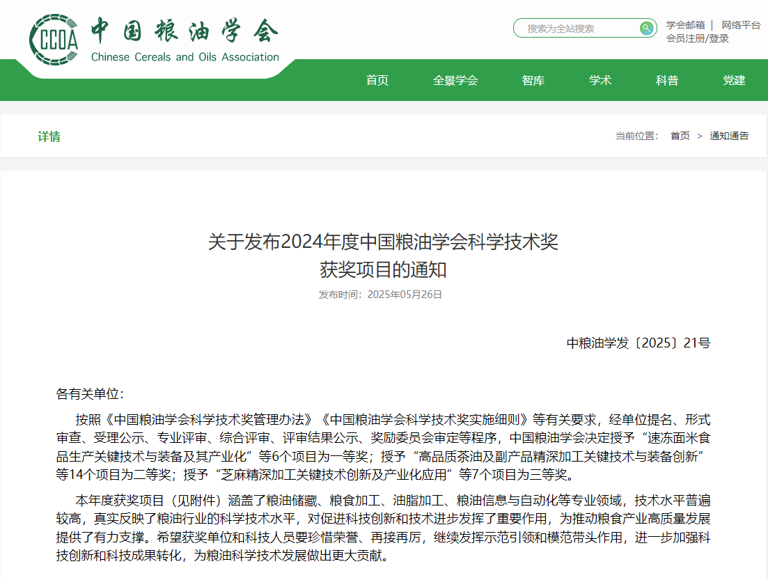 喜報(bào)|蘇州捷賽榮獲2024年度中國糧油學(xué)會(huì)科學(xué)技術(shù)獎(jiǎng)!