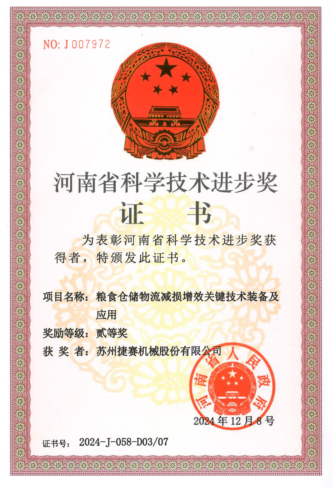 近日,河南省科學(xué)技術(shù)獎(jiǎng)勵(lì)大會(huì)在鄭州隆重舉行,大會(huì)宣讀《河南省人民政府關(guān)于2024年度河南省科學(xué)技術(shù)獎(jiǎng)勵(lì)的決定》,蘇州捷賽機(jī)械股份有限公司參與完成的《糧食倉(cāng)儲(chǔ)物流減損增效關(guān)鍵技術(shù)裝備及應(yīng)用》項(xiàng)目榮獲河南省科學(xué)技術(shù)進(jìn)步二等獎(jiǎng)!
